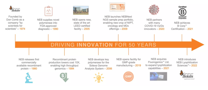 L’innovation scientifique est au cœur de la philosophie de NEB depuis sa création par Don G. Comb en 1974 en tant que collectif de chercheurs. La société s’est principalement développée à travers de nombreuses innovations guidée par ses valeurs fondamentales : la passion, l’humilité et l’authenticité. La recherche à NEB représente aujourd’hui 300 chercheurs, répartis sur 30 laboratoires, et a généré à ce jour plus de 1 450 publications scientifiques. Cette culture orientée vers l’excellence scientifique a permis à NEB de rester le leader en biologie moléculaire et d’accompagner les avancées majeures en biologie de ces 50 dernières années. NEB a commercialisé les premières enzymes de restriction recombinantes dès 1975 permettant l’essor des techniques de clonage moléculaire. Aujourd’hui, la société propose la distribution d’enzymes de grade-GMP* permettant le développement de trousses de diagnostic moléculaire mais aussi la production de vaccins dans la lutte contre le COVID-19 et autres maladies infectieuses. La société offre un vaste portefeuille de solutions qui s’étendent du séquençage au débit (NGS) à la synthèse d’ARN, en passant par l’édition de génome ou la glyco-protéomique, afin de servir les besoins des chercheurs dans un large éventail d’applications.